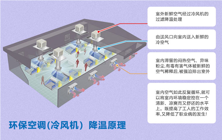 在空氣不流通的環(huán)境中,尤其是化工車間,容易產(chǎn)生建筑綜合癥,如悶熱、頭疼、眩暈、過敏、咳嗽等不適癥狀。使用環(huán)??照{(diào)(冷風(fēng)機)通風(fēng)降溫方案即可以有效降溫,又能保證空氣流通